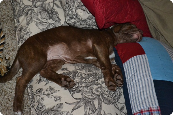 We have kind of taken things easy the last week and a half. Taking lots of naps and resting/watching a lot of shows. Sunday night we decided to have a family movie night and watch Shrek. Look who made herself all comfy!